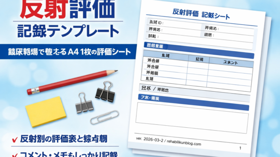 評価 腱反射スコア 0〜4+ の記録用紙【PDF付】 腱反射スコア 0〜4+ の意味、左右差、JM の書き方、SOAP の型を PT 向けに整理。A4 記録シート PDF をそのままダウンロードでき、院内の記録標準化にも使えます。 2026.03.27 評価