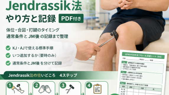 評価 Jendrassik法のやり方と記録【PDF付き】 Jendrassik法のやり方を解説。PDF記録シート付きで、体位・合図・打鍵・通常条件とJM後の記録まで整理しています。 2026.03.27 評価