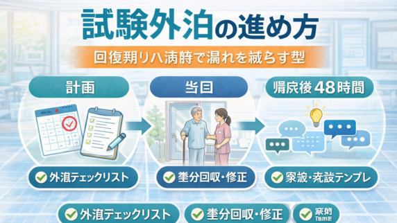 制度・実務 試験外泊の進め方|回復期リハ病棟で漏れを減らす型 試験外泊は「できたか」より差分回収が目的です。計画→当日→帰院後 48 時間の 5 分フロー、外泊チェックリスト、家族・施設への伝達テンプレを整理。 2026.02.22 制度・実務