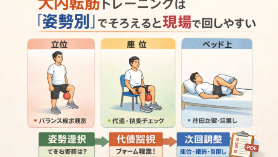 大内転筋トレーニングを立位・座位・ベッド上で整理。代償チェックと修正キュー、当日記録まで 1 枚で回せる A4 PDF 付きで臨床実装しやすく解説します。