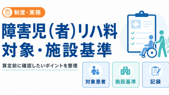 制度・実務 障害児(者)リハビリテーション料とは?対象・施設基準を解説 障害児(者)リハビリテーション料の対象患者、施設基準、職種配置、記録、集団コミュニケーション療法との違いを解説します。 2026.04.30 制度・実務