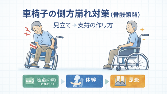 車椅子の側方崩れ(骨盤傾斜)は、座面の左右支持不足や体幹支持のズレで起きやすい。見立て→チェック表→支持の作り方を 1 ページで整理します