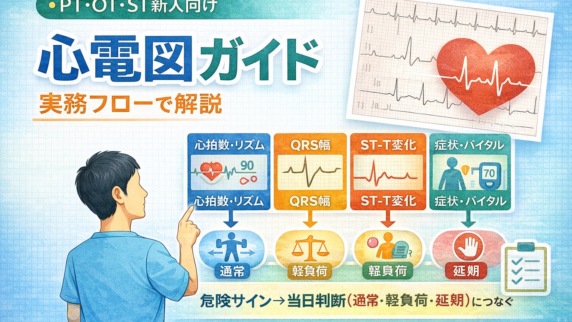 評価 頻脈・徐脈で迷わない初動|心電図実務ガイド 頻脈・徐脈に遭遇したときの PT・OT・ST 向け初動を解説。5分フロー、3区分判断(通常/軽負荷/延期)、中止・相談トリガーを新人向けに整理しました。 2026.02.16 評価