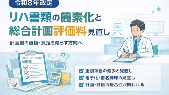 ハブ/索引 令和 8 年改定:リハ総合計画評価料と書類簡素化 令和 8 年度診療報酬改定の議論(案)から、リハビリテーション総合計画評価料の見直しと書類簡素化の方向性、現場の準備ポイントを整理します。 2026.01.21 ハブ/索引