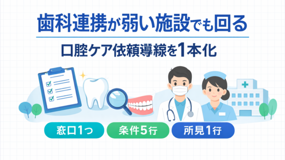 制度・実務 歯科連携が弱い施設でも回る|口腔ケア依頼導線を 1 本化 歯科連携が弱くても、口腔ケア依頼の入口を 1 本に固定すれば現場が回ります。窓口 1 つ/依頼条件 5 行/所見 1 行テンプレと、失敗の回避・記録の残し方まで解説。 2026.01.27 制度・実務