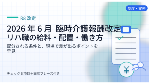 2026 年 6 月 の臨時介護報酬改定で、リハ職の給料・配置・働き方はどう動く?配分が落ちる条件と、面談で聞く 5 つの確認フレーズ、施設別の詰まりどころを早見で整理。