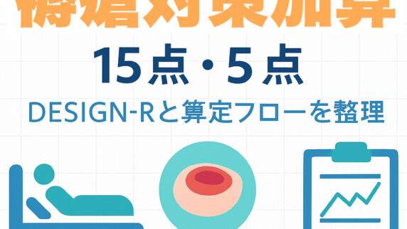療養病棟の褥瘡対策加算1(15点)と2(5点)の違いを、DESIGN-Rの3か月ルールと入院後3か月以内の扱いから整理します。A4のDESIGN-R推移集計シート付きで、病棟全体の算定フローを確認できます。