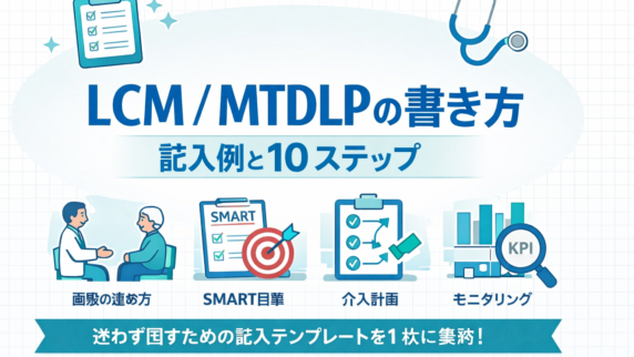 生活行為向上マネジメント( LCM / MTDLP )の書き方を、記入順テンプレで整理。面接の質問例、SMART 目標、KPI、介入計画、モニタリングまで 1 ページで迷わず回せます。