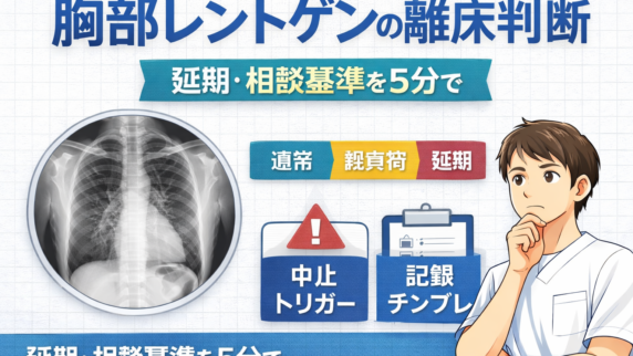 評価 胸部レントゲンで離床を延期する基準|新人向け判断ガイド 胸部レントゲン所見を当日離床判断へつなぐ新人向け実務ガイド。延期・軽負荷・通常の3区分、中止トリガー、相談基準、記録テンプレをわかりやすく解説します。 2026.02.18 評価