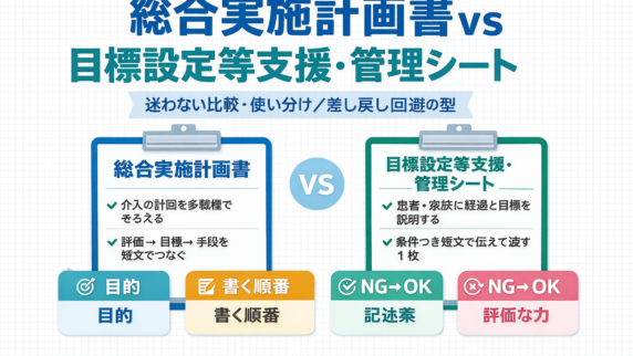 総合実施計画書と目標設定等支援・管理シートの違いを比較。目的・書く順番・差し戻しが起きる NG を整理し、PT/OT/ST が最短で統一運用できる型をまとめます。