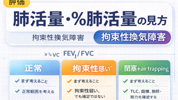 評価 肺活量・%肺活量の見方|拘束性換気障害 肺活量(VC)と%肺活量(%VC)の見方を、FVC との違い、低値の読み方、1 秒率との組み合わせ、拘束性換気障害をどう考えるかまで整理します。 2026.04.11 評価