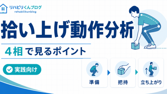 評価 しゃがみ込み・拾い上げ動作分析|4相評価と記録PDF付き 床の物を拾う動作を4相で整理。安全確認、観察ポイント、声かけ、記録例とA4記録PDFを新人PT向けに解説します。 2026.04.28 評価