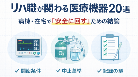 臨床手技・プロトコル リハ職が関わる医療機器 20 選|観察と中止基準 リハ職が病棟・在宅で遭遇する医療機器を 20 個に整理。目的・観察・中止目安・記録の型を一覧で把握し、各論へ回遊できます。 2026.02.05 臨床手技・プロトコル