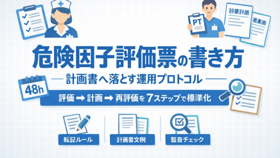 臨床手技・プロトコル 危険因子評価票の書き方【計画書に落とす院内運用プロトコル】 危険因子評価票は「評価して終わり」だと変化が出ません。ADL 自立度 B/C を対象に、入棟 24 時間以内→計画書転記→ 48 時間以内の効果判定までを 7 ステップで標準化。看護計画・ PT 指示文の文例、監査チェックも掲載。 2026.01.14 臨床手技・プロトコル