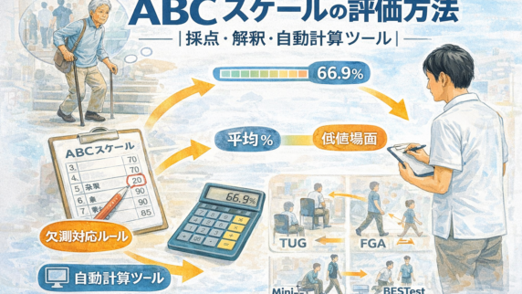 ABC スケールの採点、平均の出し方、欠測の扱い、解釈、記録テンプレ、自動計算ツールまで PT 向けに整理。PDF 記録シート付きで実務にそのまま使えます。