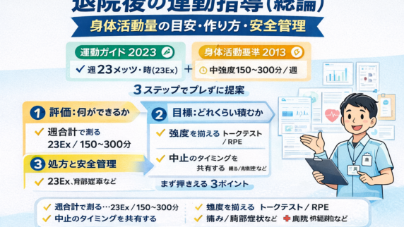 退院後の運動指導を「目安→評価→処方→フォロー」の型で整理。成人は週 23 メッツ・時( 23 Ex )や 150–300 分を軸に、強度設定(トークテスト/ RPE )と中止基準、記録のコツまで 1 ページで解説します。