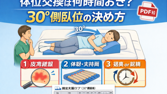 臨床手技・プロトコル 30° 側臥位の体位交換間隔|延長・短縮の判断と記録 体位交換の間隔は一律ではなく、30° 側臥位を軸に皮膚所見・支持面・体動で決めます。延長・短縮の判断、夜間運用、記録用 PDF まで 1 ページで整理。 2026.04.01 臨床手技・プロトコル