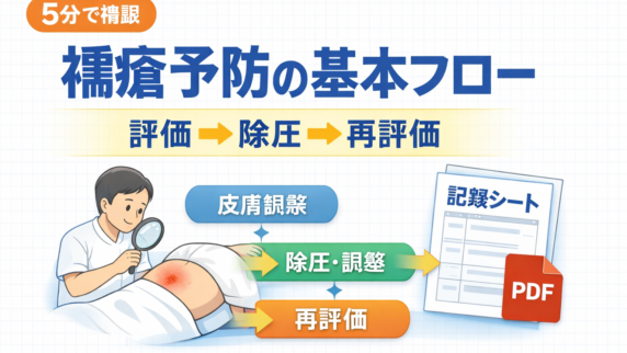 臨床手技・プロトコル 褥瘡予防の基本|評価→除圧→再評価と記録シート 褥瘡予防で迷う PT 向けに、評価→除圧→再評価の順番を整理。所見別の次の 1 手、5 分フロー、図版、PDF 記録シートまでまとめて確認できます。 2026.04.15 臨床手技・プロトコル