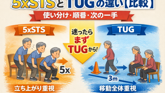 評価 5xSTS と TUG の違い【比較】|使い分け・順番・次の一手 5xSTS と TUG の違いを比較します。何を見る評価か、どちらを先に使うか、転倒・立ち上がり・サルコペニアでの使い分け、よくある失敗、次の一手まで PT 向けに整理した実務記事です。 2026.03.31 評価
