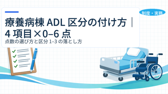療養病棟の ADL 区分を 4 項目×0–6 点で迷わず判定。点数の選び方、合計点→区分 1–3 の落とし方、よくあるズレと回避策まで整理。
