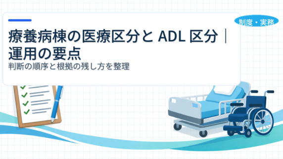 療養病棟の医療区分(疾患・状態/処置)と ADL 区分を、現場でズレない運用に整理。判断の順序、根拠の残し方、よくある失敗と回避手順までまとめます。