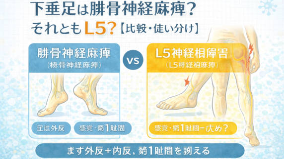 疾患別 下垂足は腓骨神経麻痺?それとも L5?【比較・使い分け】 下垂足を「腓骨神経麻痺(腓骨頭) vs L5 神経根障害」で比較し、運動 3 筋+感覚 1 点で 5〜 8 分整理。見分けのコツ、リハ(装具・歩行課題・筋再教育)と共有の型、受診相談の目安まで PT 向けにまとめます。 2026.01.30 疾患別