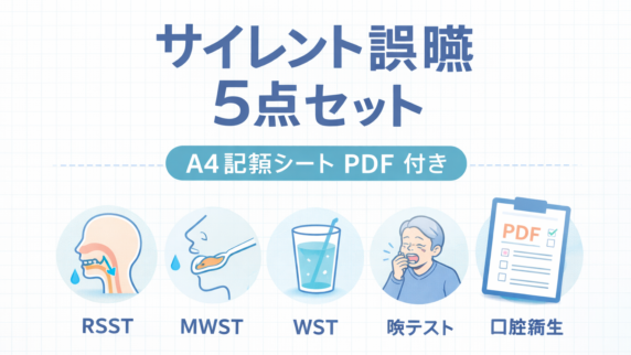 サイレント誤嚥を疑う場面で、5点セットの順番・読み方・中止基準を1本で整理。A4記録シートPDFと図解つきで、RSST・MWST・WST・咳・口腔観察の運用がわかります。