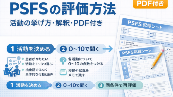 腰痛 PROM は RDQ か ODI を固定し、必要時に PSFS を追加するのが実務的です。選択フロー、比較表、記録テンプレ、失敗回避を 1 ページで整理。