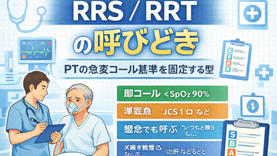 臨床手技・プロトコル RRS/RRT の呼びどき|PT の急変コール基準 急変は「呼ぶ基準」と「SBAR」を先に固定すると遅れません。RRS/RRT の起動目安、NEWS2 の閾値、PT が伝える 1 行テンプレをまとめます。 2026.02.21 臨床手技・プロトコル