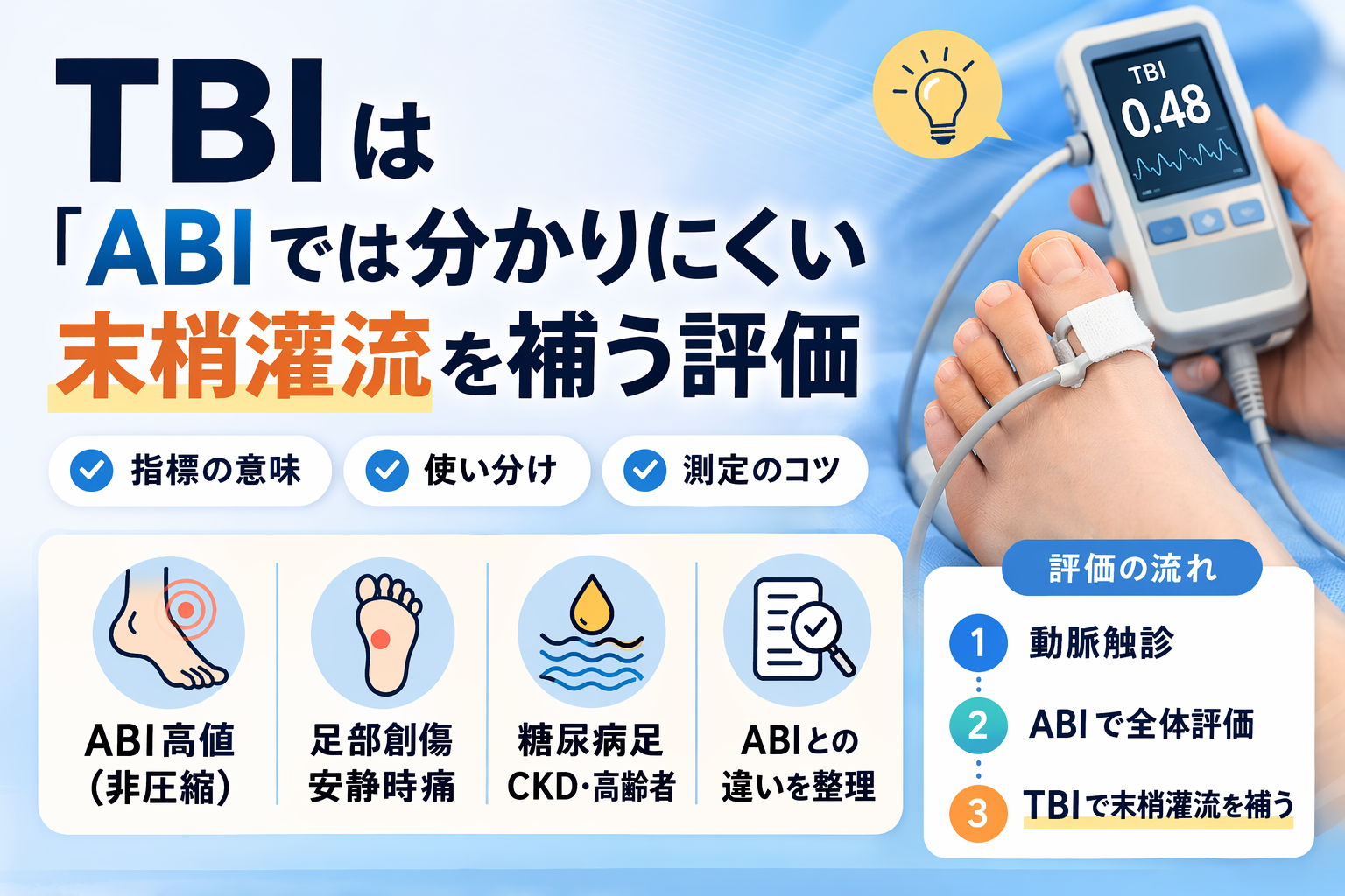 いいえ。 TBI は ABI を置き換えるというより、 ABI を補う追加評価です。とくに ABI が高値で解釈しにくいときや、足部創傷・安静時痛で末梢灌流を詳しくみたいときに役立ちます。