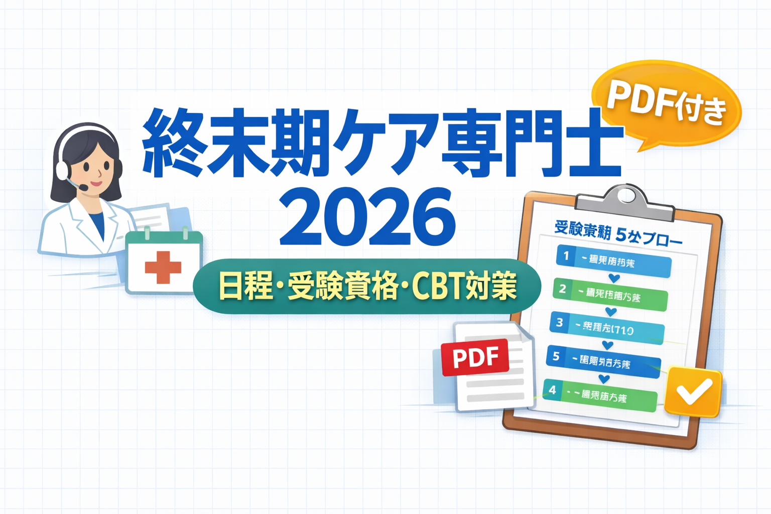 終末期ケア専門士 2026 は、受験可否・締切・ CBT 候補日・勉強開始の順番を先に整理しておくと止まりにくくなります。印刷して使える 受験準備 5 分フローシート を用意したので、申込前の確認や勉強計画の整理にご活用ください。