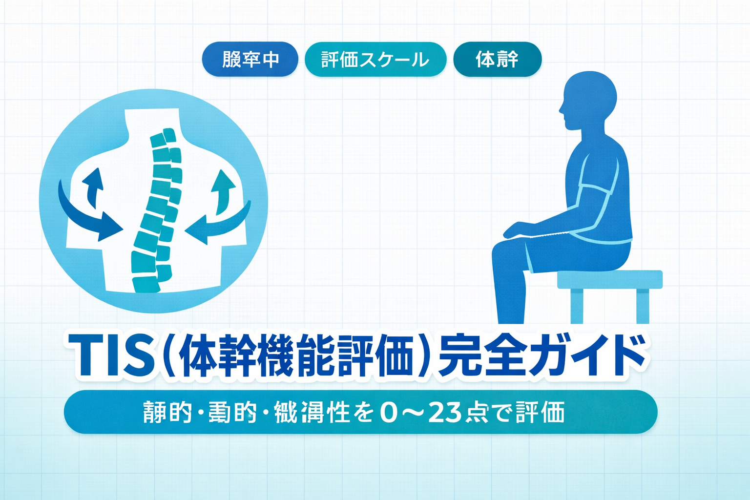 TIS は一般に、静的座位バランス、動的座位バランス、協調性の 3 下位尺度で構成され、合計は 0 〜 23 点(高いほど体幹機能が高い)で評価します。尺度の目的は、座位での体幹機能を “できたか” だけでなく、動きの質や分離運動の程度として把握し、治療のガイドにすることです。