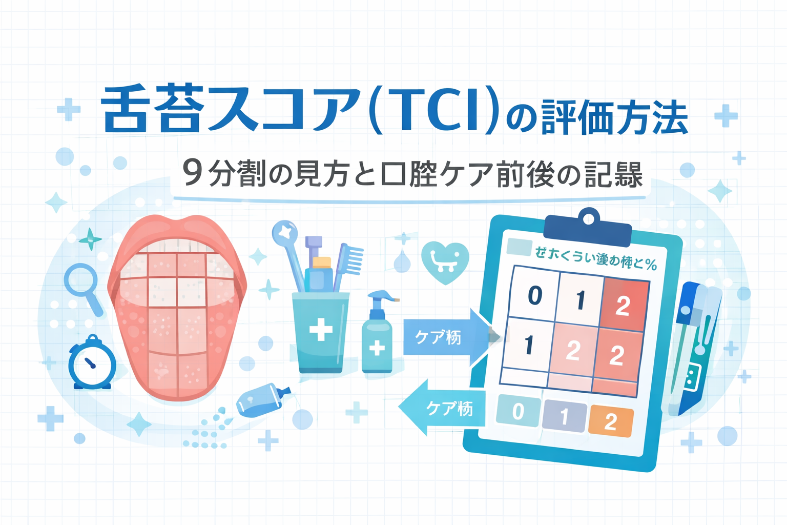 TCI( Tongue Coating Index )は、舌苔を 9 区画で観察し、口腔衛生の状態を点数化する評価です。誤嚥性肺炎のリスクが気になる場面では、「何を優先してケアするか」の判断材料になり、ケア前後の変化も追えます。