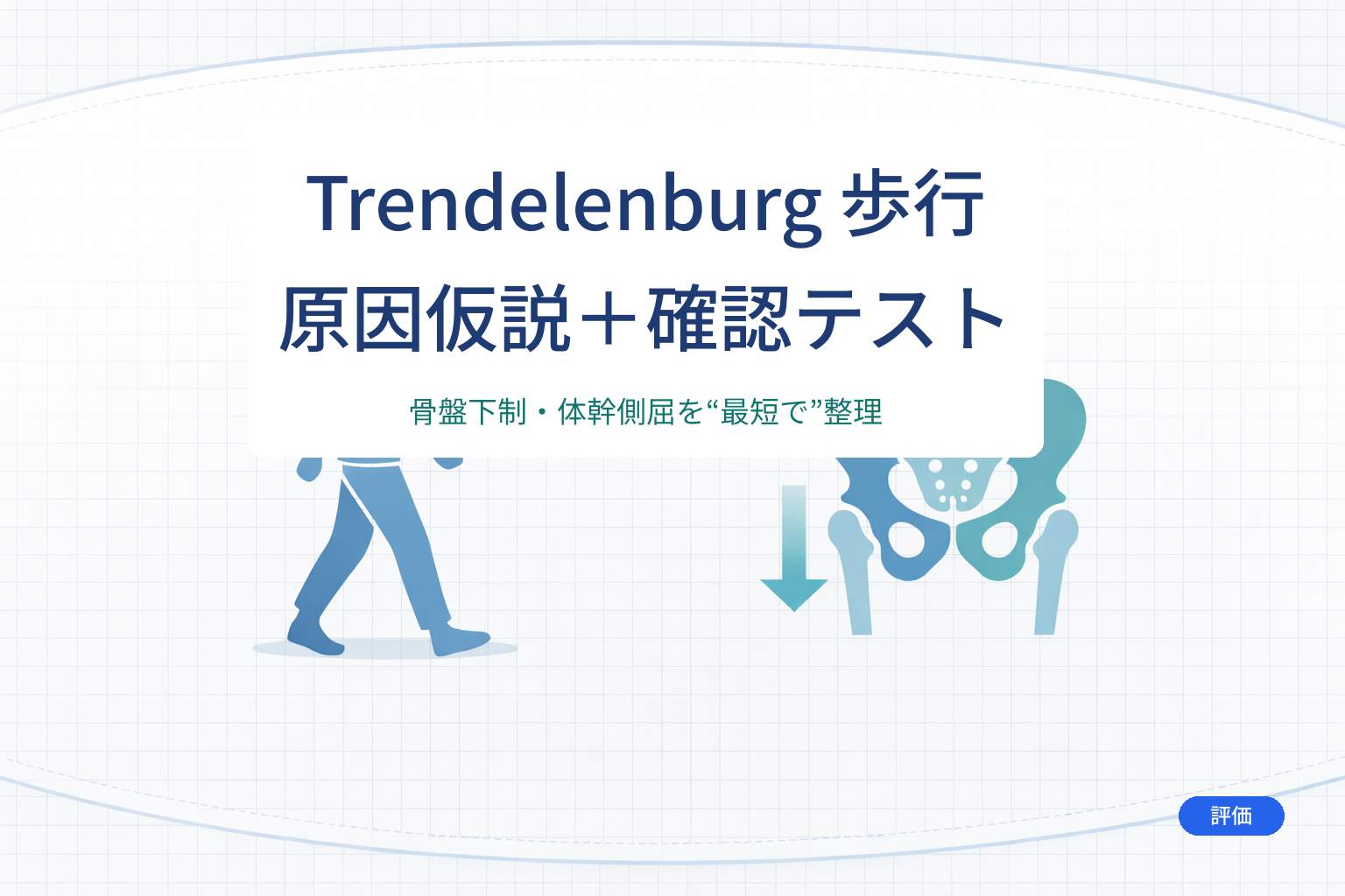 Trendelenburg(トレンデレンブルグ)歩行は、立脚で反対側の骨盤が下がる(骨盤下制)所見です。よくある落とし穴は「中殿筋だけ」と決め打ちして外すこと。本記事では、①筋出力・タイミング/②疼痛回避/③体幹・支持戦略(バランス)の 3 本柱で候補を絞り、最小の確認テストに接続する運用に固定します。