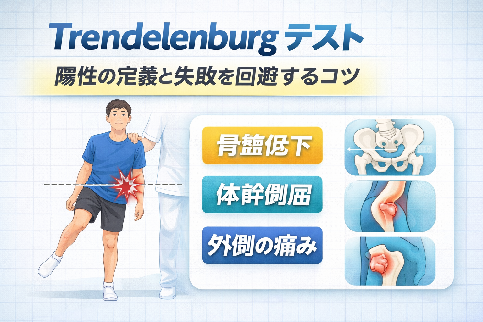 Trendelenburg の “ 陽性 ” は、教科書的には片脚立位で対側骨盤が下がる所見です。一方で臨床では、同じ骨盤低下でも代償(体幹側屈)痛み部位によって意味が変わるため、次の 3 点セットで記録するのが実用的です。