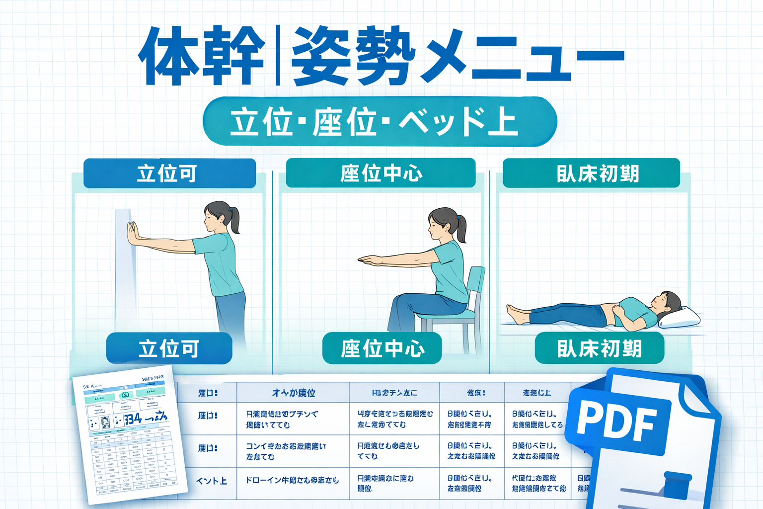 体幹介入は、患者さんのフェーズに応じて立位・座位・ベッド上を切り替えられる設計にしておくと、現場での判断が速くなります。とくに「どの姿勢で何を実施したか」を記録様式まで一体化すると、申し送りと再評価の質が上がります。
