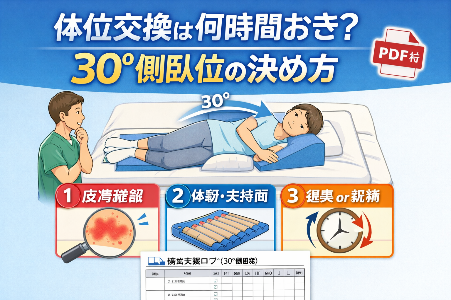 現場でそのまま使えるように、体位交換ログ(30° 側臥位)を A4 PDF にまとめました。間隔決定・皮膚確認・申し送りを 1 枚で共有したいときに使えます。