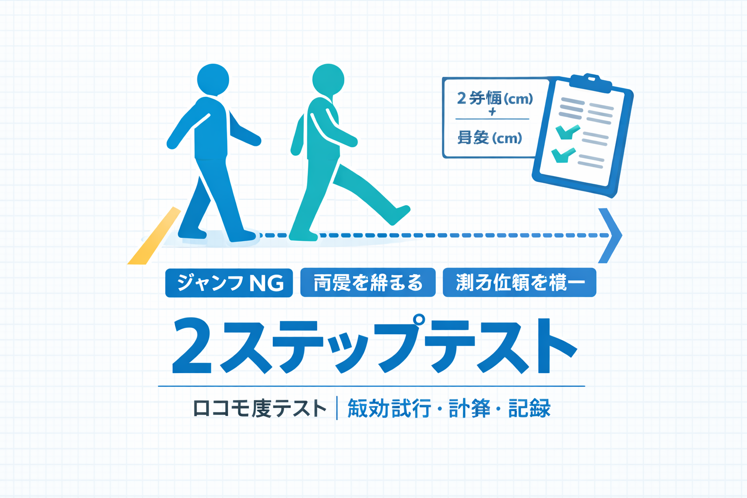 2 ステップテストは、歩幅(ストライド)を指標にして、下肢筋力・バランス・柔軟性などを含む歩行能力を総合的に捉える目的で用いられます。ロコモ度テストは「 2 ステップテスト」「立ち上がりテスト」「ロコモ 25 」の 3 つで構成され、いずれか 1 つでも該当があればロコモと判断する枠組みで普及しています。