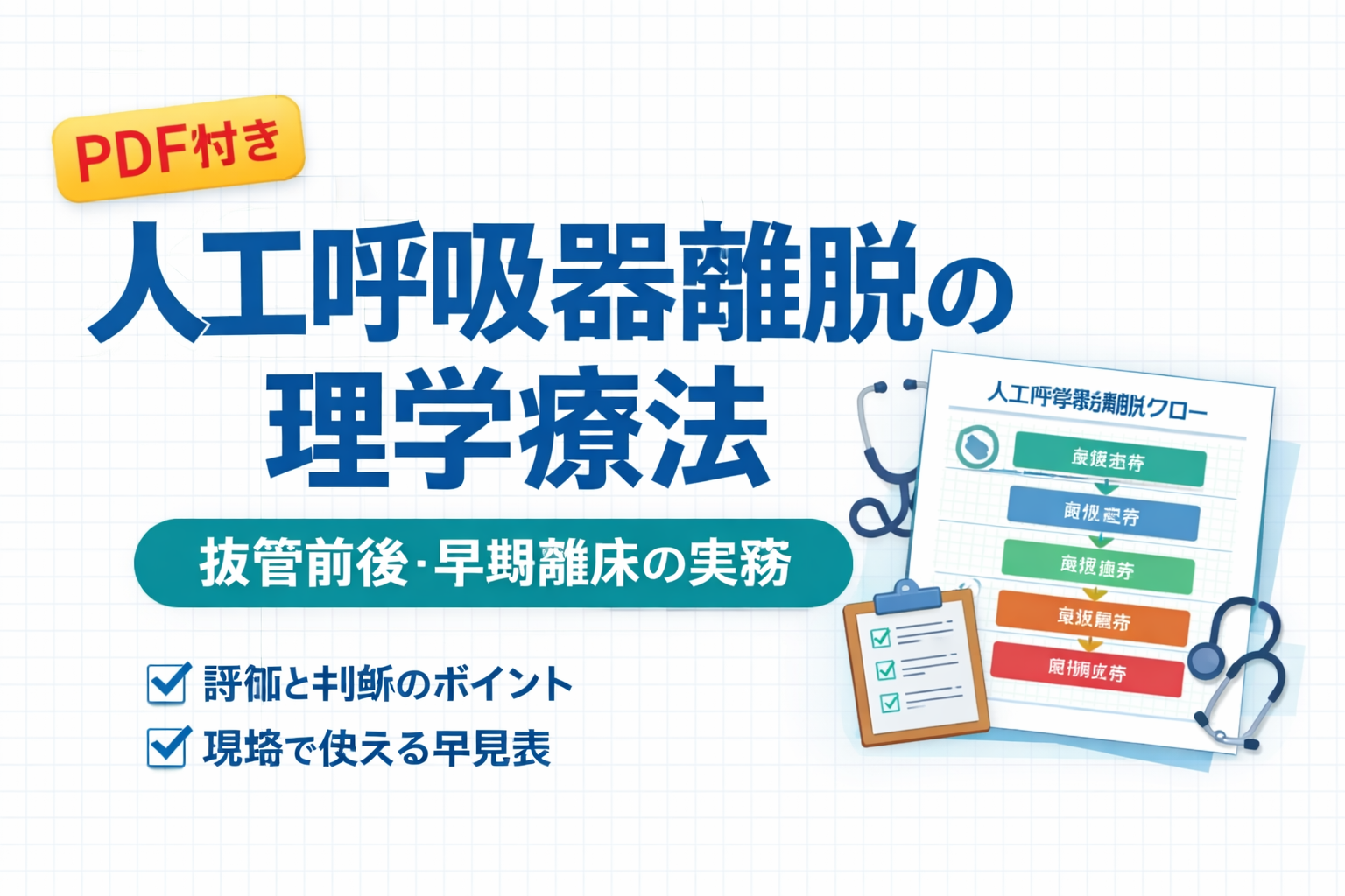 離脱に向けた PT の介入は、評価項目を増やすほど現場で回りにくくなります。まずは ①安全(酸素化・循環・覚醒)②喀出(咳嗽・分泌物)③離床耐性(端坐位・立位・歩行)④抜管前後の追加確認⑤共有(数値 × 場面) の 5 段で固定します。