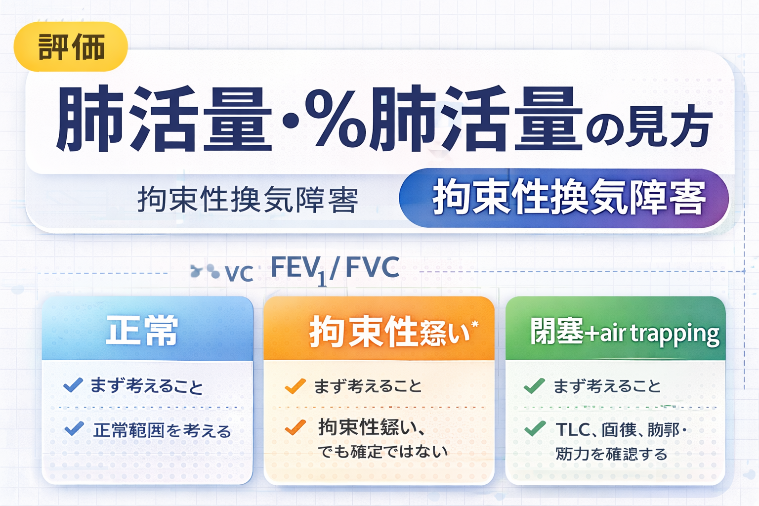 つまり、%VC が低いときは、「拘束性かもしれない」と考えるのはよいのですが、そこから先は1 秒率、VC と FVC の差、肺気量検査、画像、症状で詰める必要があります。ここを飛ばして「%VC 低下=拘束性」と書いてしまうと、誤読につながります。