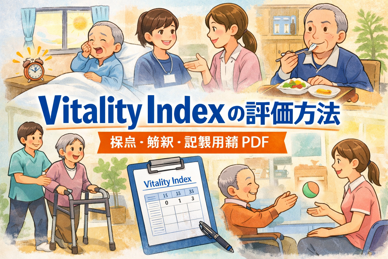 Vitality Index は、本人の自己回答が難しい場面でも、行動としての自発性を短時間でそろえて見やすい尺度です。このページで答えるのは、5 項目をどう観察するか、0 / 1 / 2 点をどうそろえるか、低得点をどう次の介入につなげるかです。単に点数を出して終わるのではなく、再評価で比較できる形まで整理します。