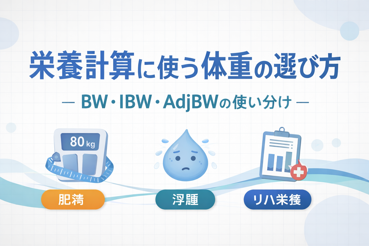 結論としては、①まず「増えたのは脂肪か水分か」を見立て、②計算に使う体重( BW / 乾燥体重 / IBW / AdjBW )を決め、③同条件で再評価できる記録に落とす——この順にすると、栄養とリハの調整が回ります。