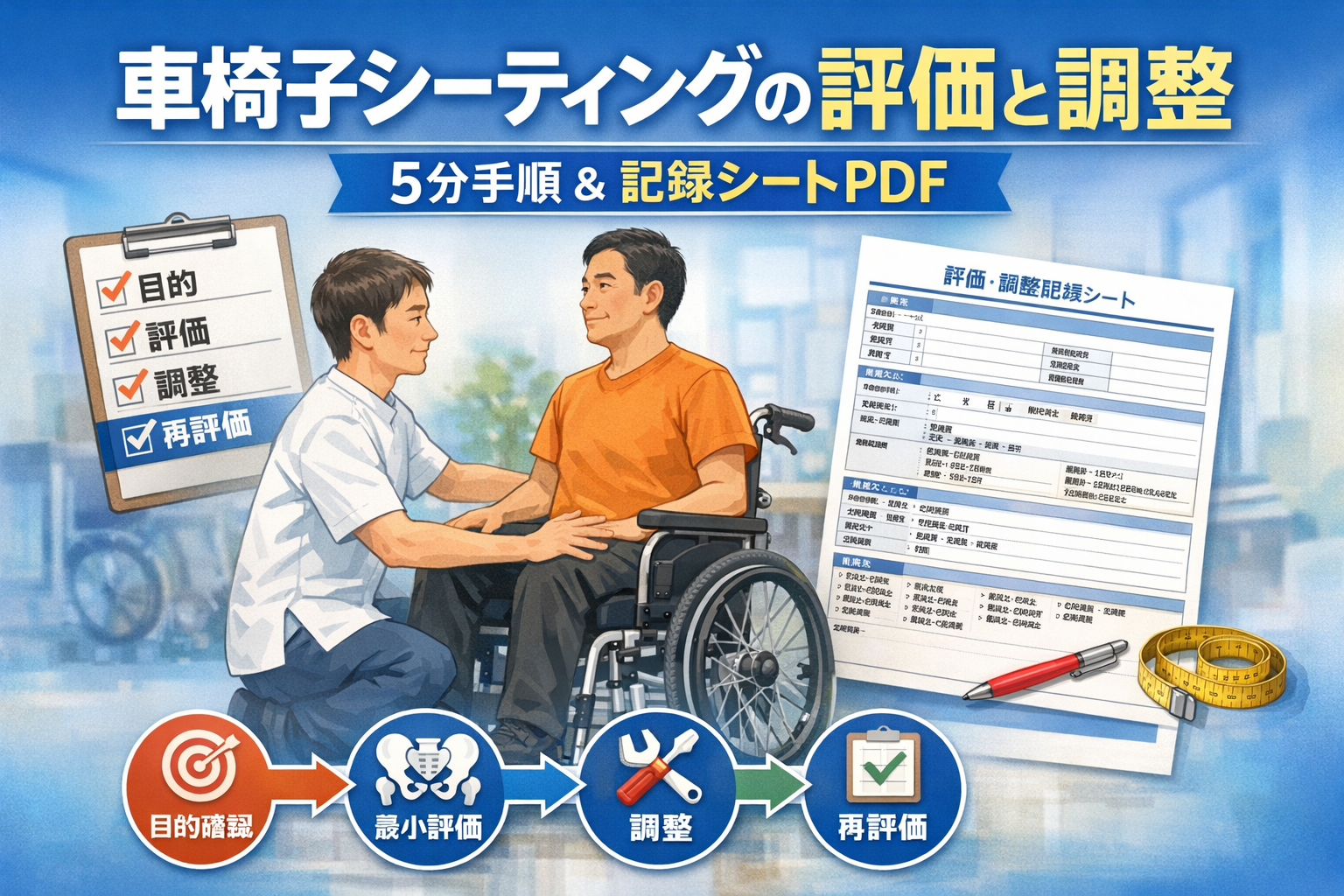 車椅子シーティングの「最小評価セット → 調整 → 再評価」を 1 枚にまとめた印刷用 PDF です。院内共有や申し送りで、前後差を残しやすい形にしています。