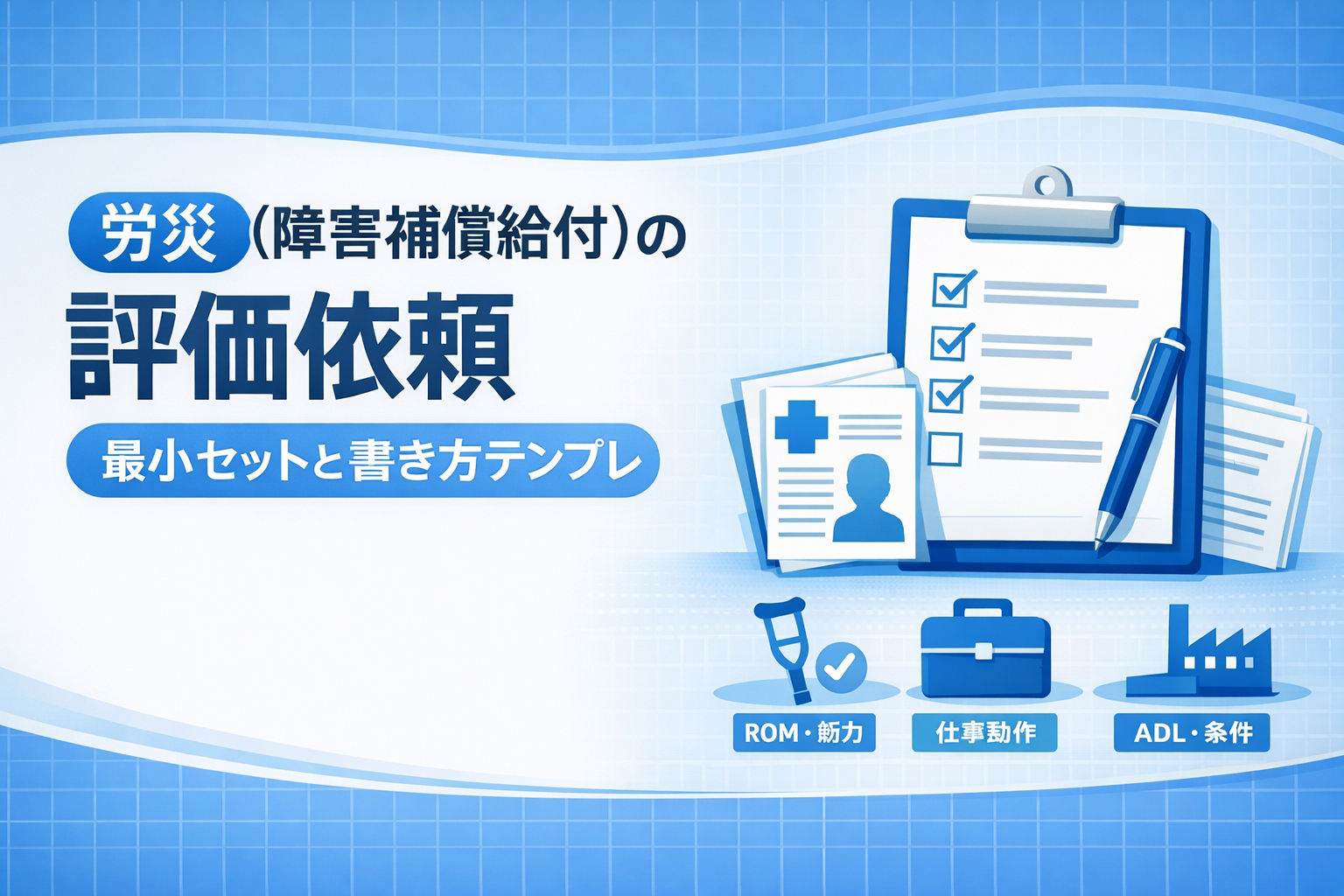 労災(障害補償給付)の請求では、医師が作成する診断書に、障害の状態を裏づける所見が求められます。現場では、その裏づけに使える ROM ・筋力・移動・ ADL などの情報を、リハ職に依頼して集めるケースが多いです。